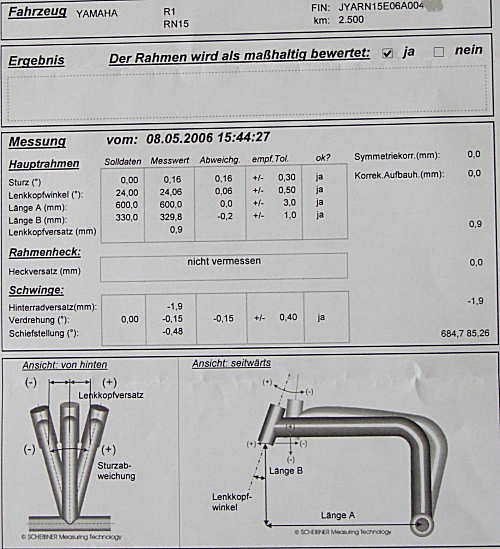 | Die Gabelbrücken wurden noch einmal explizit vermessen. (Vielen Dank an Johann Eisenmann von PLPE und an Herrn Maaßen von BKG) Das Ergebnis ist sehr gut! Sicher war, dass die obere Brücke verzogen ist, aber was ist mit der Unteren? Der Verzug ist deutlich unter den normalen Toleranzwerten der R1. Jetzt wird eine neue obere Gabelbrücke von BKG bestellt. |