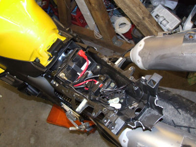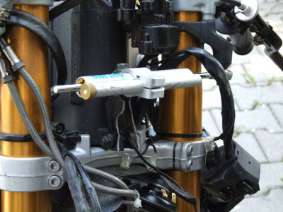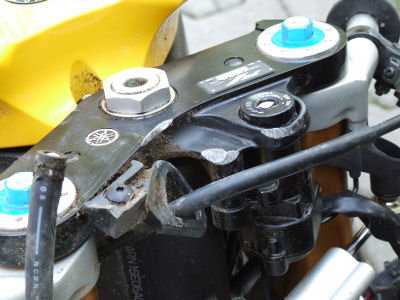 ![]() Abgesehen davon, dass die komplette Verkleidungskanzel atomisiert wurde, sieht man hier deutlich die Spuren, die (vermutlich von der Leitplanke) auf der oberen Gabelbrücke hinterlassen wurden |