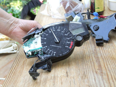 ![]() Die Tacho-Einheit ist nur noch als Fragment erhalten. Was sich beim Zerlegen noch so alles als defekt herausgestellt hat: